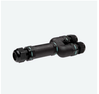 Compact and durable 3-pole Y-branch connector for safe and reliable power cable derivation in demanding indoor and outdoor environments.